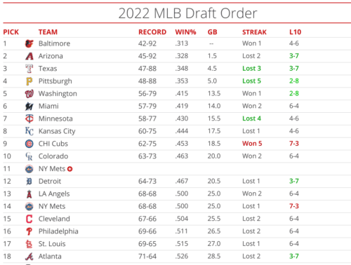 UPDATE (11:32 a.m.)- Both the Diamondbacks and Rangers lost last night, but the Orioles beat the Yankees so in terms of the 2022 MLB Draft standings, both the Pirates, Rangers, and Diamondbacks move up a game on the O’s. As it stands now the Pirates are 5.0 games back of the Orioles, 3.5 back of the Diamondbacks, and 0.5 games back of the Rangers.